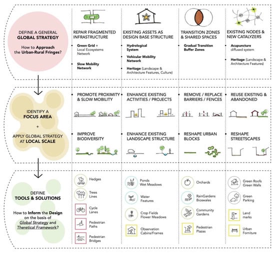 Regarding the research area, the local traditional rural and architectural elements were selected based on the site’s particular features. In the case of replication in a different site, similar but site-specific elements should be identified, and the methodology adapted to the local idea/characteristics. Based on these findings, an overall strategy can be articulated comprising multivalent and site-specific tools. The aim is to enhance the connectivity between city and traditional rural landscape, and reverse the fragmentation, degradation and loss of ES occurring by urban sprawl pressure.