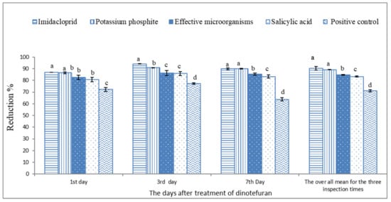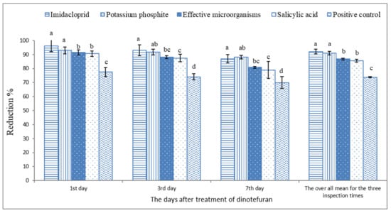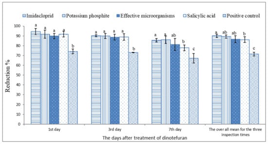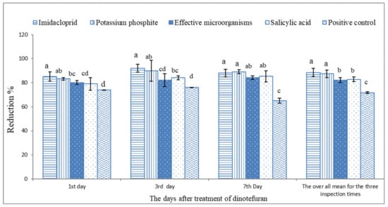 The reduction percentage of silverleaf whitefly nymph population on sweet pepper based on the non-treated plants during 2019. Each column means reduction values of silverleaf whitefly nymphs with the standard error. Different letters above the bars of the same day indicate a significant (p < 0.05) difference as determined by Tukey’s test.