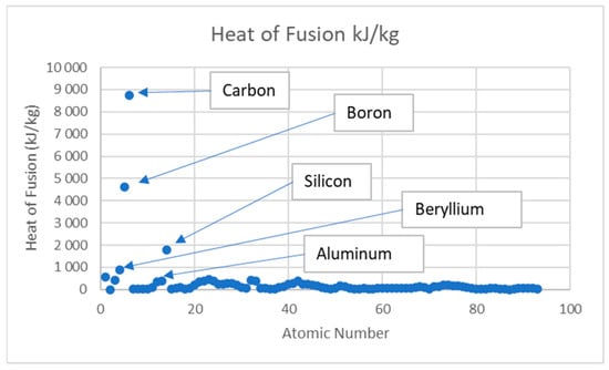 where , the concentration of element i, (%) , is the heat of fusion of element i (kJ/kg). Four elements differ from most other elements, plotting the respective heats of fusion. C and B are commonly found in grain refiners and used in minimal additions, Figure 1. This is also true for Be that in some regions around the world is present in minute amounts in gravity die-casting alloys such as EN-AC42xxx or similar to protect Mg from oxidation during melting. On the other hand, Si plays a central role in recycling and is used in large quantities to transform wrought materials into high-pressure die-casting alloys such as EN-AC46xxx alloys. Si is one of the elements with a high heat of fusion, Figure 1.