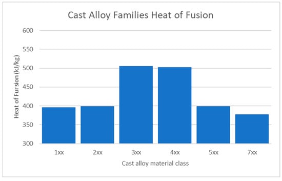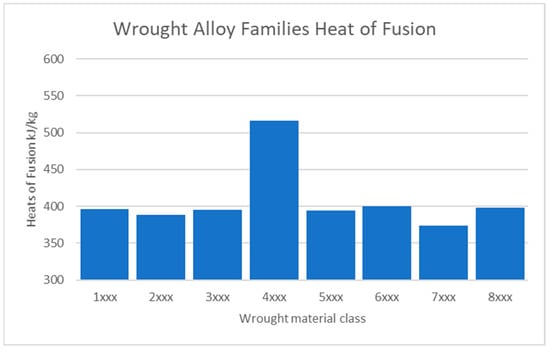 The latent heat of fusion variation in the wrought alloy families is displayed as averages over the alloy families (Figure 2) and with the data collated in Appendix A (Table A2). Two families differ from the others, 4xxx and 7xxx. The 4xxx has a significantly higher heat of fusion originating from the heat of fusion of Si. The 7xxx family has a lower heat of fusion owing to the Zn content. Based on this, the inclusion of the 4xxx alloy in a circular material approach would significantly increase the energy in each cycle.