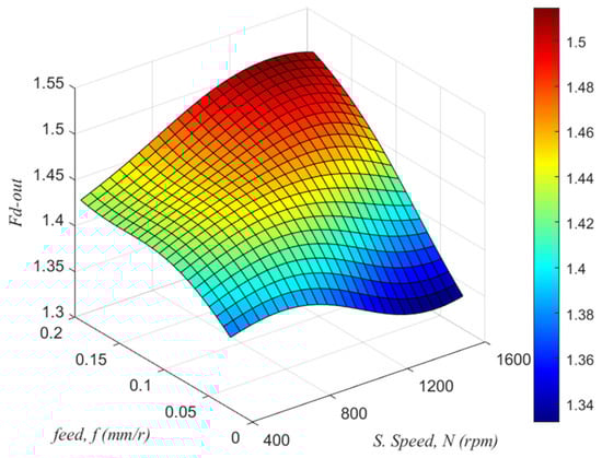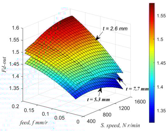 Regarding delamination factor, the surface plots for the Fd-out shown in Figure 2, plotted using the obtained quadratic equation, can be used for estimating the Fd-out values for any appropriate combination of the machining parameters: f, N, and t. Figure 2 illustrates that the delamination factor increases with the increase in the feed and decreases with the increase in the spindle speed. It is noticed that with the decrease in laminate thickness, the Fd-out increases. The effect of the feed can be explained: as the feed is increased, the area of the chip increases, where resistance to the cutting of the material is higher. Therefore, large efforts are required to remove the chip [35]. Moreover, Figure 2 elucidates that as the thickness increases, the delamination factor decreases.