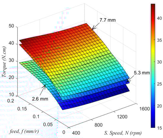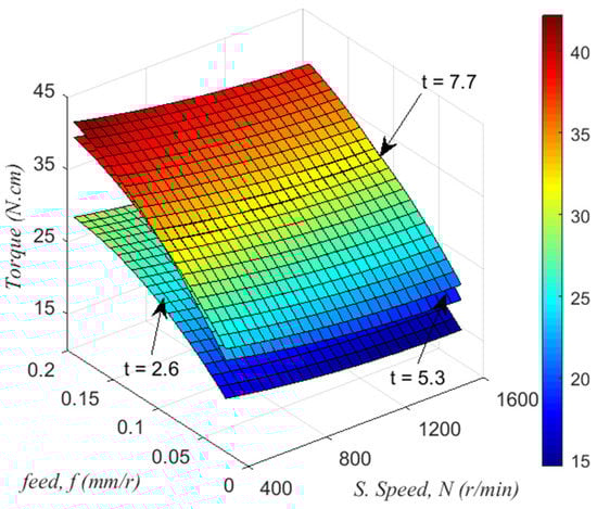 Regarding the required power (P) for the drilling process, which can be calculated by , the 3D surface plots shown in Figure 3 can be used for predicting the torque values for any appropriate machining parameter combinations. Figure 3 demonstrates the evolution of the maximum torque, according to the speed and feed for each thickness of the laminate.