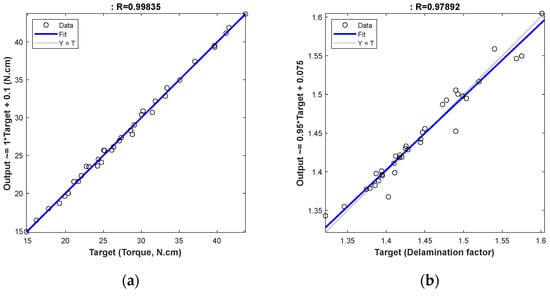 Regression plot between experimental and predictive results of ANN–PSO models: (a) torque (N·cm) and (b) delamination factor.