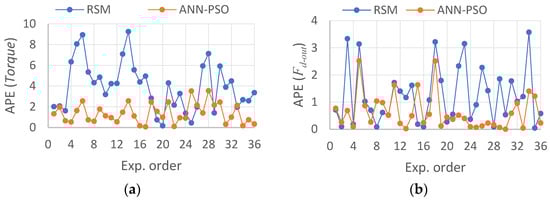 Figure 8 illustrates the absolute percentage error (APE) in the prediction process of the proposed models. The maximum APE in the prediction of torque and Fd-out by the ANN–PSO model is 3.55% and 2.52%, respectively, while by the RSM model, it is 9.25% and 3.58%, respectively, as shown in the figure.