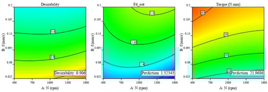 Figure 9 and Figure 10 show the desirability-contour and ramp-function mapping for torque and delamination factor. Determining the optimal machining parameters to minimize delamination factor is the main objective of the optimization, as well as torque, which has a significant role in the consumed power needed for the drilling process. Table 9 shows the machining parameters used in the optimization process. While Table 10 illustrates the optimal values of the control factors and drilling process responses obtained by the RSM model.
