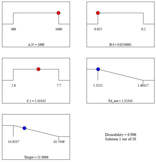 The selected 10 conducted trials show that at a low level of feed, a high spindle speed, and a medium level of laminate thickness, the reduction in delamination factor and torque are attained with a desirability factor of 0.906. According to Table 10, the optimal drilling parameters (f = 0.025 mm/r, N = 1600 rpm, and t = 5.43 mm) resulted in a minimal delamination factor of 1.32, with an appropriate torque of 21.9 N·cm.