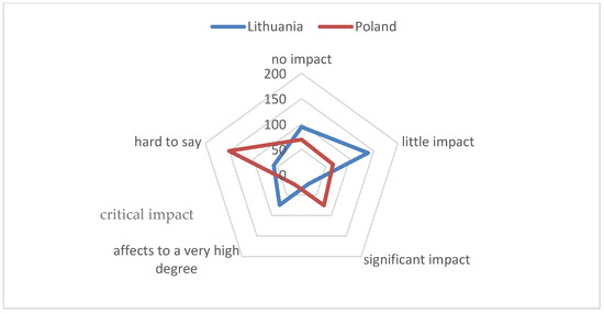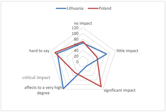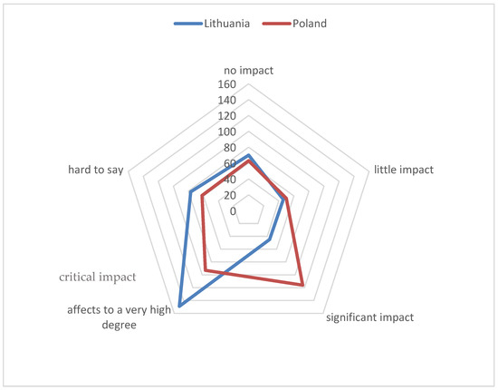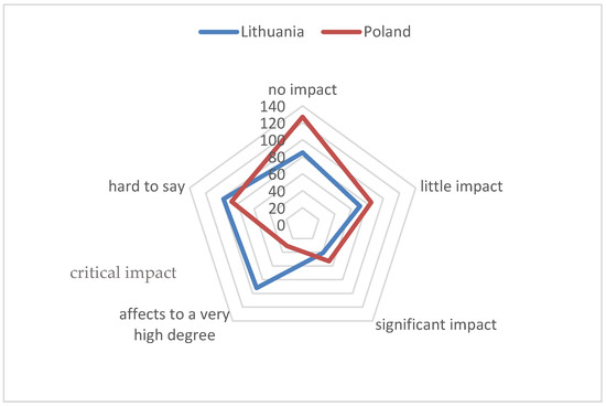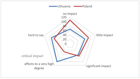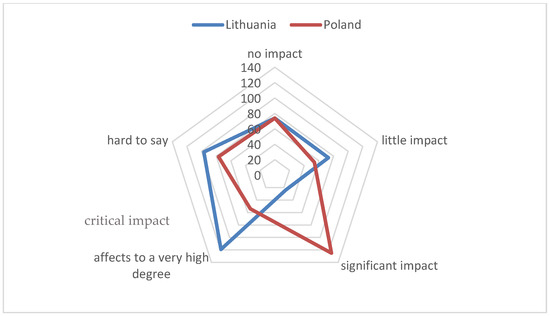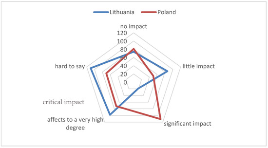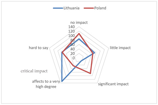 Figure 6), stating that it would have a “critical impact”, with 28% of the Polish respondents claiming that it would have “significant impact”. Although there were some discrepancies among the Polish residents (“hard to say”—28%), a relatively large number of Lithuanian residents selected the “little impact” option (23%).