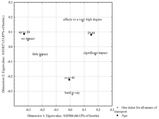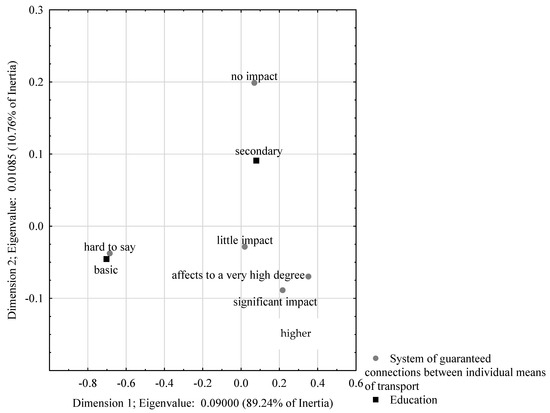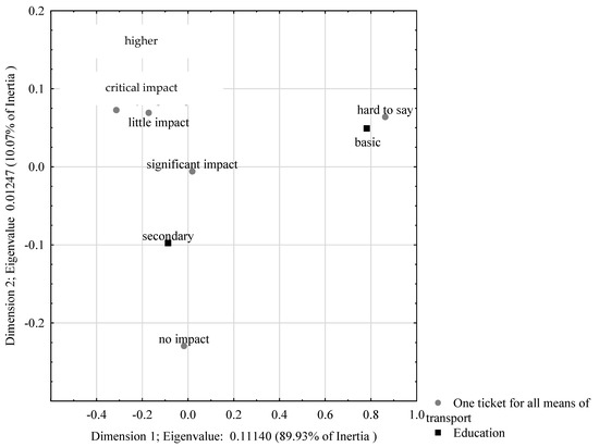 Figure 10, it can be seen that the first dimension is dominant, explaining 89.93% of the total variation. The second dimension accounts for just over 10%. People with higher education were most in favour of the idea of a common ticket for all means of transport. The remaining respondents either did not have an opinion on this issue or did not believe that such an innovation would improve the mobility of residents.