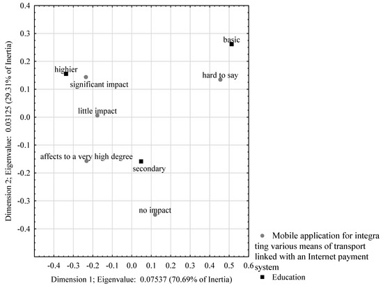 Figure 12). The first dimension, explaining 89.24% of the total variation, is dominant. In this case, respondents with higher education believed that this innovation would have a significant or even very significant impact on the improvement of mobility.