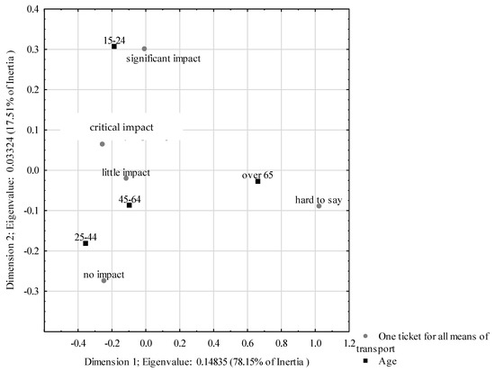 Figure 15 shows the correlation between the age of the surveyed Lithuanians and their ability to use an online ticket sales system. The data indicate that the first dominant dimension explains 80.96% of the total variation, while the second explains 15.82% of it. Four age groups have been distinguished, with only people aged 15–24 being strongly in favour of such a payment method and respondents aged 25–44 considering it to be of little importance. There was little support for this solution in other age groups.