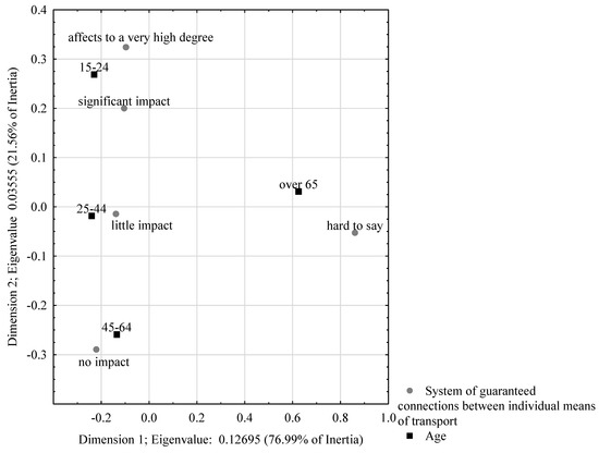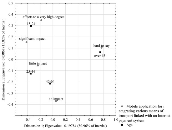 Figure 10 show that the first dimension is also dominant in this example, explaining 70.69% of the total variability. The second dimension explains 29.31% of this value. The perceptual map shows that the online payment system was expected primarily by people with higher education. Individuals with secondary education did not believe it would improve mobility. This indicates that while such people are familiar with digital technologies, they are not convinced about their utility value. On the other hand, respondents with primary education were not able to assess (hard to say) whether such a solution would help improve their mobility. In this case, it can be assumed (with a high degree of probability) that these respondents are not familiar with modern technologies, which makes them cautious about assessing the effectiveness of proposed solutions to mobility problems.