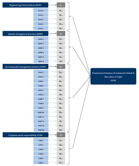 It should be noted, however, that studies analysing the combined effects of the different components impacting on restaurants’ sustainability are still scarce [31]. Indeed, no study in the previous literature was found to concentrate, simultaneously, on the effects of quality management practices (QMP), environmental management practices (EMP) and corporate social responsibility practices (CSR) on restaurants’ financial performance and the resulting business sustainability. This is even more obvious in introducing to this subject of analysis the possible use, by restaurants, of regional agri-food products (RAP) as a way to increase their financial performance.