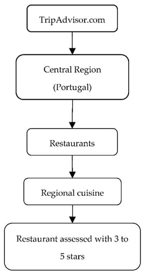 Given the geographical area and objective guiding this study, to select restaurants to include in the study, regarding the filters available on Tripadvisor.com, the only way to ensure that the restaurants in the selection had a link to their place of origin was in the “Good for” section, from the selection filters menu, choosing the option “regional gastronomy”. Thus, the following sequence of procedures was implemented: (1) “geographical area”; (2) type of establishment, with selection limited to “restaurants”; (3) type of cuisine, selecting the characteristic of: “good for regional cuisine”; and (4) establishments classified with between three and five stars (see Figure 2).