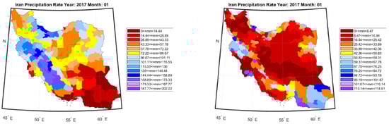 Each precipitation prediction in the CFSV2 model is for a specific year and month. The model is executed several times each day and on different days. Therefore, it has multiple predictions for each month. These predictions with 90 variables for each and the observations for the same year and month are matched together, so the dataset for post-processing is created. In Figure 1, the CFSV2 precipitation predictions in Iran have been compared with observations.