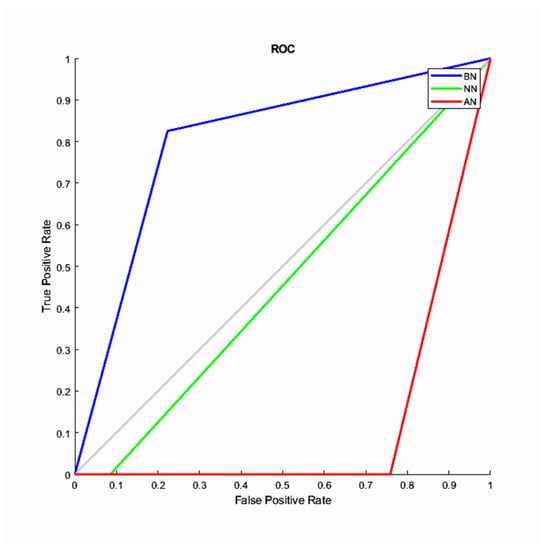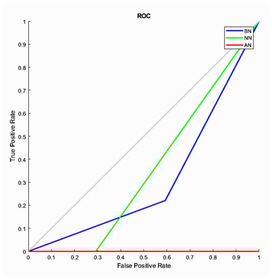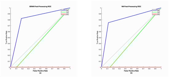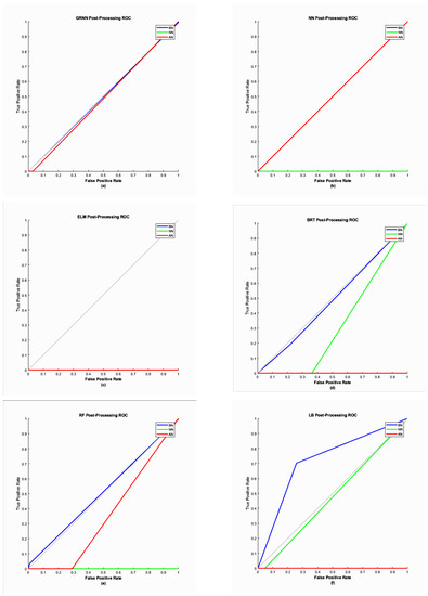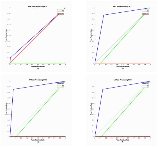 ROC plot for six post-processing algorithms: (a) GRNN, (b) NN, (c) ELM, (d) BRT, (e) RF, and (f) LB.