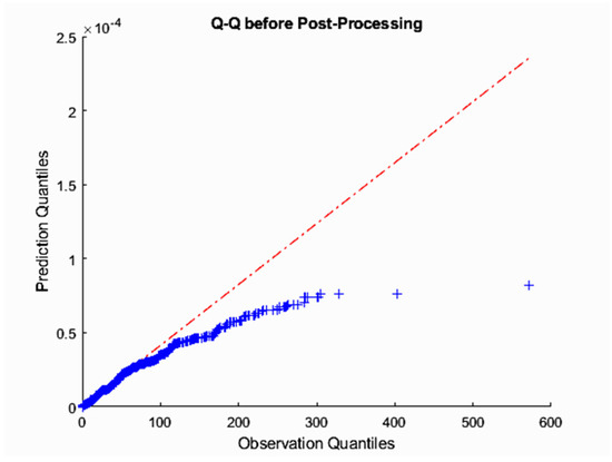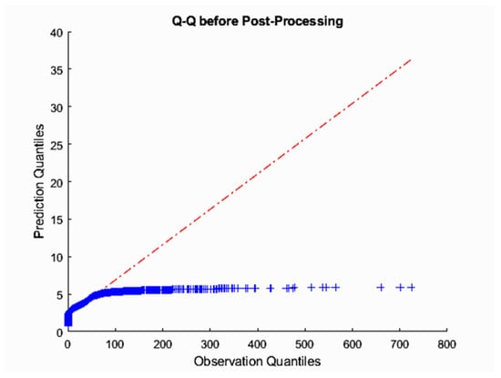 The Q-Q plot is used to investigate if two sample data are from the same distribution. Here, the two-sample data were the observations and predictions. If the observation and predictions came from the same distribution, the result was a linear plot. In Figure 4, the Q-Q plot is shown for predictions before post-processing. The gray line is useful in this chart to compare the observations for the blue, red and green lines.