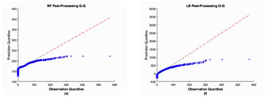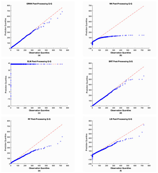 Q-Q plot for six post-processing algorithms: (a) GRNN, (b) NN, (c) ELM, (d) BRT, (e) RF, and (f) LB.