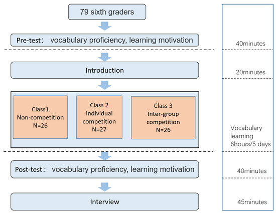 The overall process of this experiment is shown in Figure 2 below. A total of 79 students were randomly assigned to three classes. Class 1 played the non-competitive game, class 2 played the individual competitive game, and class 3 played the inter-group competitive game. Before the teaching activities, all the students took an English vocabulary proficiency test and completed a questionnaire on learning motivation. We allocated computers to the class 1 and class 2 students. In order to make it easier for the students of class 3 to cooperate and communicate, each of them was assigned an iPad (because Quizlet supports both computer and tablet terminals). After that, a 5-day English vocabulary summer camp was held, during which the study time was 6 h a day, with 30 min of English vocabulary play time four times a day.