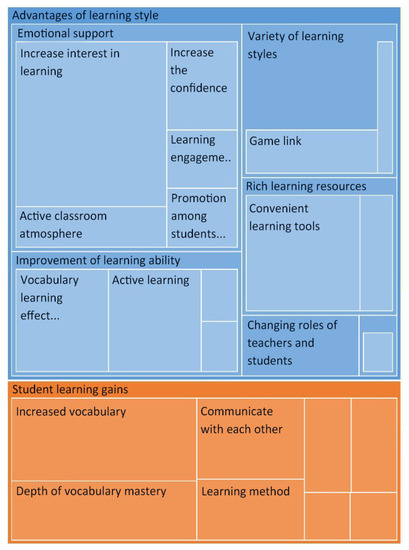At the same time, in order to understand the reasons for the impact of inter-group competition, the interview responses of students in Class 3 were extracted and summarized, and the advantages of the inter-group competition mode for students’ learning were obtained, as shown in Table 5. In addition to the learning gain and improvement of learning ability brought by competition, the advantages of inter-group competition are as follows: their study pressure was reduced, their weak vocabulary memory was deepened, there was a strong classroom atmosphere and high student participation, their communication was strengthened, and they were able to obtain emotional support which can also be found in the blue area of the text encoding in Figure 4. First of all, the form of inter-group competition involved intra-group cooperation so that everyone shared the pressure equally, thus making the study easier. In addition, when students made mistakes in the competition, the members of the group would correct them and explain, so as to deepen their memory of the words. Secondly, the inter-group competition brought students a strong immersion learning experience. The way of combining study and play made students actively participate in the study, and the pleasant learning atmosphere enlivened the classroom atmosphere. Finally, it is worth noting that intra-group cooperation provided emotional support for the students. Some students mentioned that this way is conducive to students’ experience the feeling of being supported. The encouragement brought by peers makes them more confident in learning. Especially for students with poor performance, this form of learning can reduce their frustration.