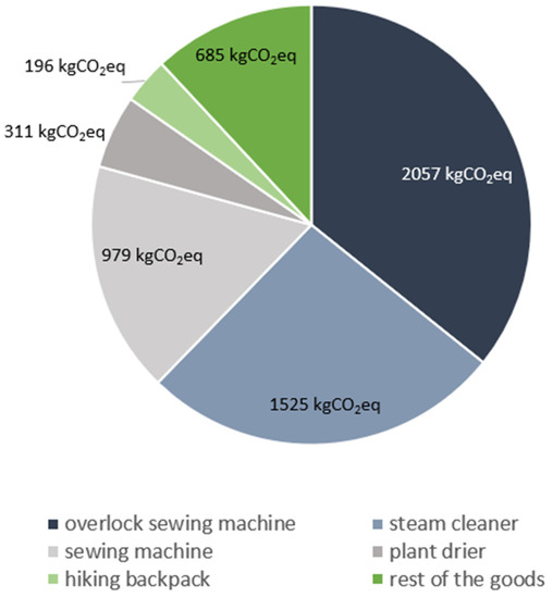 Assuming that, with each loan, the purchase of (i.e., manufacturing) a new good was avoided, the total sum of avoided GHG emissions would be 5752 kg CO2eq. The GHG emission reductions achieved via the five most often loaned items are presented in Figure 1. This value includes replacing the sewing machine, which broke down once and was replaced. However, it is unlikely that a goods purchase was actually avoided with each loan. Even if it was assumed that buying a new item was avoided with 50% of the loans, the avoided GHG emissions would be 2876 kg CO2eq. As the emissions of goods are estimated based on their prices and intensity factors, these are only rough estimations. There are, however, some existing LCA studies on household appliances according to which the CF of a vacuum cleaner is approximately 40 kg CO2eq [52], the CF of an electric kettle is approximately 10 kg CO2eq [53] and the CF of a coffee machine is 8–30 kg CO2eq [54]. In comparison, when using the prices and intensity factors, the CF of a blender is 20 kg CO2eq, and the CF for an ice cream machine is 33 kg CO2eq. For the more expensive goods, the CFs are possibly somewhat overestimated when using intensity factors. For example, the CF of a sewing machine is 70 kg CO2eq, and the CF of a drill is 63 kg CO2eq, while Concito [36] estimated the CF of a drill to be 28 kg CO2eq.