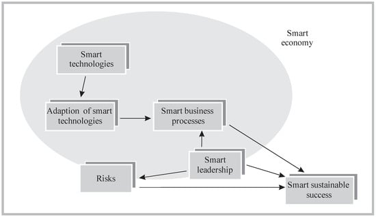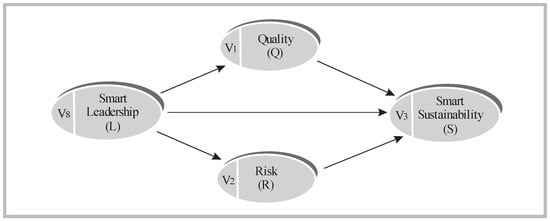 - Very high correlation coefficients were achieved between smart leadership and smart sustainability (0.769), smart leadership and smart quality (0.710), and smart leadership and risk (−0.627), as expected (Table 4).