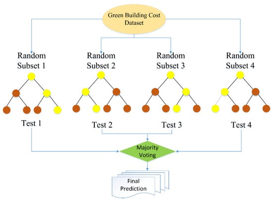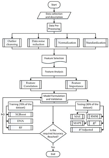 The main aim of this study was to develop a forecast model for providing accurate green building project costs. Data collection, feature selection, machine learning algorithm formulation, and model evaluation are the four major stages of the suggested methodology. The methodology flowchart is illustrated in Figure 1.
