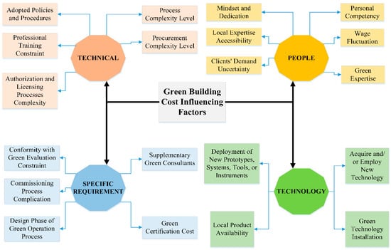 The factors that influence the cost of green building projects are listed as follows: people, technical, technological, and specific requirements, and external support. For more detail, Table 2 presents a description of these features. All features impact the total building project cost in terms of hard and soft costs. In addition, Figure 2 is included to provide a better view of these features that affect the overall cost of green building projects.