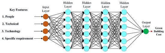 is a subset of deep learning algorithms that employ multi-layered neural network training and testing to learn complex structures and achieve appropriate abstraction levels. The dataset is directed in one direction within the network, passing the four hidden layers []. Such movement improves the memory of the neural network to process sequential data naturally. The technique has two stages: The first stage (training) is applied to optimize the network parameters to complete the expected goal (prediction). The second stage (testing) assesses whether the trained model can process a new dataset. The six layers in this study (i.e., the input layer, four hidden layers, and the output layer) were employed to retain the best prediction model accuracy, as presented in Figure 5.