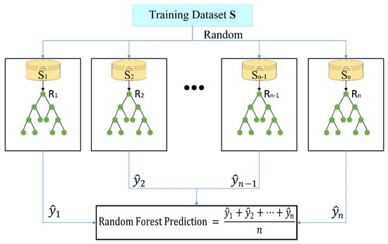 This algorithm has been frequently utilized in data mining applications to cope with classification and regression issues []. The is a classification and regression technique that uses a set of classification trees, a bootstrap sample of the data applied to create these sets. The variables are chosen at random at each split as the candidate set of variables for tree building. Employing bagging is the second way that can be used to integrate unsteady learners successfully. The is a robust algorithm with several merits, such as forecasting accuracy, dealing with many features, fast simulation speed, high performance, and free applications []. In this study, two primary indicators (i.e., the number of grown trees and leaf size) determined the accuracy and proficiency of the RF. The number of grown trees and leaf size ranged from 0 to 3000 and 1 to 20, respectively. The model became more stable with reliable results in the case of 400 grown trees and two leaf sizes. In addition, in this study, “bootstrap samples” ( were created from the original dataset, and then these random samples were used to construct trees (). Finally, these trees were combined, as shown in Figure 7.