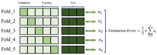 The K-fold cross-validation process was applied to develop the model’s accuracy by examining the algorithm performance on various datasets. In addition, the model hyperparameters were tuned using a K-fold cross-validation technique. First, the database must be separated into subsets for training and testing the modeling process. During this process, the training dataset is partitioned into multiple ‘k’ smaller portions. The term ‘K-fold’ was coined as a result. Then, testing is done with K-fold, while training is done with k-1. Both are also based on a random dataset. In addition, the model hyperparameters are tuned using a K-fold cross-validation technique. The prediction model is then fitted to the training set using the best possible hyperparameter configuration. Consequently, each fold is only utilized as a validation set once. Finally, the accuracy measures for each fold may be compared, and if they are similar, the model is likely to generalize well, as shown in Figure 8.