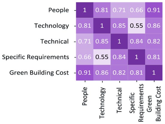 Pearson’s correlation process was conducted between the selected features and the cost values of green building projects to assess the influence of these features on each other and the observed values, as presented in Figure 9.