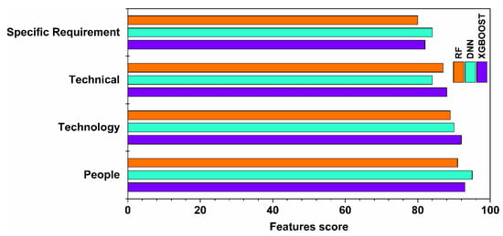 Better insight and understanding of the model’s features help decision-makers plan and formulate policies effectively. As a result, a feature importance process was carried out using the , , and techniques to identify the importance degree of each feature included in forecasting green building costs. As illustrated in Figure 10, the feature scale plot was implemented to calculate a relative score for each variable. In addition, as presented in Figure 10, the features were ranked in descending order of importance: people, technological, technical, and specific requirements.