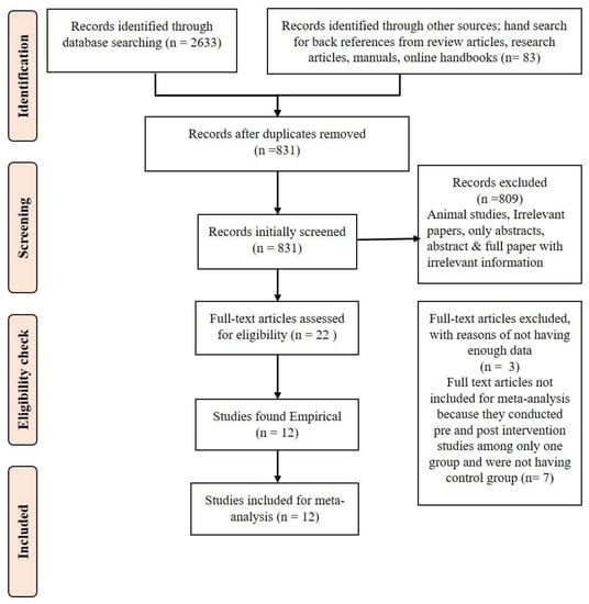 Twelve studies were included in the meta-analysis. The PRISMA flow diagram (Figure 1) illustrates the systematic process involved in selecting the eligible articles. Details of study characteristics are given in Supplementary Table S2.