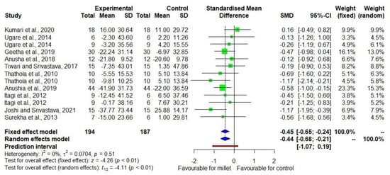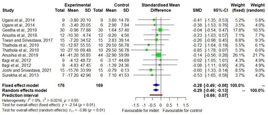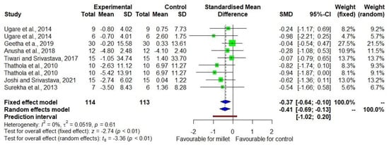Figure 2 shows the DID in TC level among ten [19,20,21,22,23,24,25,26,27,28] studies with low heterogeneity (I2 = 0). The effect size was −0.44 with a 95% CI of −0.68 to −0.21. The reduction in TC was 6.6% (p = 0.011) in the millet consuming group while there was no significant change (p = 0.311) in the control group consuming other staples (Supplementary Table S3).
