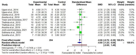 Forest plot showing the effects of millets vs. conventional staples consumption on triacylglycerol levels [20,21,22,23,24,25,26,27,28].