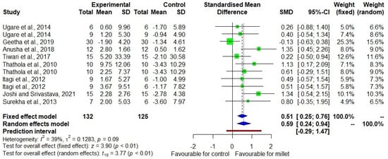 The heterogeneity (I2) of outcomes varied from 0% to 75%, indicating that there was only moderate heterogeneity possibly due the varying duration of studies. The homogeneity could have resulted from the studies that were conducted in less diverse geographical regions (i.e., most studies were conducted in India). Subgroup analysis was not conducted, as few studies included each type of millets or other staple (e.g., there was only one study conducted with sorghum as a food for the intervention group and one study used quinoa as a food for the control group). Therefore, regardless of the type of millets, the study tested millets against the other staples (rice, wheat, and quinoa).