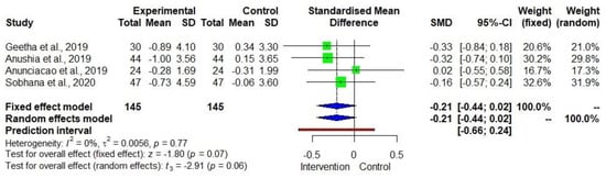 Figure 7 shows the DID in BMI among four studies [21,25,29,30] with low heterogeneity (I2 = 0). The effect size was −0.21 with a 95% CI of −0.44 to +0.02. However, the p-value was relatively small (p = 0.06) despite the small sample size. The BMI decrease in the treatment group was weakly significant (−2.5%, p = 0.068) while there was no significant change (p = 0.715) in the control group (Supplementary Table S3).