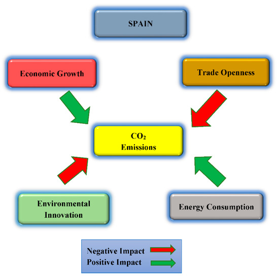Environmental destruction has been caused by deregulatory processes. Deregulatory processes are, therefore, claimed to cause enormous ecological damage by many environmentalists. At least in advanced economies with few implementation gaps, strong regulations typically entail stronger regulation of emissions, pollution, and resource use. There is a plethora of studies on the influences of carbon dioxide emissions on the ecosystem’s health and other strong determinants triggered by some microeconomic and macroeconomic factors. For economic prosperity, a sustainable environment is crucial [10]. Hence, with the expansion and evolution of countries around the world, researchers are becoming increasingly interested in shedding further light on complex associations between these variables. As a result, there have been interactions between emerging and advanced economies, which have inevitably led to an increase in economic activity. All governments should prioritize managing the pace of financial and economic development so that this does not negatively impact climate quality [11]. Ecological improvement happens when economic growth reaches an affluent level where environmental concerns begin to increase. Therefore, deterioration of the environment and economic growth have a U-shaped relationship [12]. Climate change debates place great emphasis on energy because both growth and consumption must be considered. Thus, finding a healthy balance between growth and the environment is a critical concern for policymakers. When energy demand increases, developing a zero-carbon economy is a financial and social burden as fossil fuel is the principal source of carbon emissions [13]. Empirical studies on foreign direct investment and research development are essential to further understanding the energy industry’s role in economic growth, carbon emissions, and energy investment for a low-carbon society. Energy investments for zero-carbon economies must be addressed through research and development, and foreign direct investment must be addressed as well. The EU is a global economic leader; it is expected to grow by 4.3% in 2022, so generating social capital is necessary [12]. Energy investment can stimulate economic growth while decreasing the carbon content of the energy sector and stabilizing total greenhouse gas emissions. Thus, many empirical studies have proposed that green growth be viewed as a crucial strategy in the attainment of sustainable development [14,15]. The utilization of ecofriendly alternative sources of energy (biomass, hydro, solar) is necessary for neutral atmospheric CO2 emissions [16]. In comparison with the damage it has on economies, it is imperative that nations of the world invest in renewable and environmentally friendly technologies. However, green alternatives are widely considered to be too expensive, which might discourage nations, especially emerging countries, from changing their behavior. As a result of renewable sources, nations can lower their dependency on imported energy sources that are not renewable. In what ways does trade openness influence carbon intensity? In addition to providing a theoretical basis for developing trade policies in the future, the above questions can also help determine how foreign trade activities can be regulated in order to achieve low-carbon development goals, thus helping to develop trade policies in the future. Depending on the channel, trade can have a direct or indirect effect on carbon emissions; however, the interrelationship between the two is unclear [17,18]. Several studies have posited that there exists an underlying linkage between trade openness and economic growth [19,20,21,22,23]. Ecologists and trade economists believe the role of trade liberalization in creating conditions for environmental improvement can be enhanced by utilizing resources efficiently and maintaining a sustainable growth rate [24]. Lastly, the study claimed that liberalizing trade and protecting the environment will boost economic growth and benefit society by strengthening the internalization of environmental instruments, improving the allocative efficiency of markets, and correcting market failures. Trade liberalization will also improve the quality of life in many developing countries and minimize poverty, which has been attributed to environmental degradation. Evidence that trade openness contributes to environmental degradation differs among countries according to their income levels. This may be due to different policies, economic structures, economic openness levels, and country-specific characteristics that could explain these different factors. Therefore, renewable sources stabilize the macroeconomic performance of nations [25,26]. The principal novelty of this study is that it examines the role of patents on environmental innovation as a socioeconomic driver of Spain’s carbon emissions in addition to some vital economic, social, and atmospheric metrics. Previously, patents on environmental innovation have received insufficient to no attention. Thus, this study provides new evidence for executing specific CO2 policy by including patents in the total energy needs, as well as expanding the common EKC model by including patents as a new variable. Secondly, by examining the connection between energy consumption and environmental patents using advanced economic techniques, this study is useful since the Spanish government is focused on the increase of environmental technologies; environmental sustainability; stimulating the economy; creating jobs; modernizing industry; strengthening competitiveness; enhancing energy security; and supporting research, development, and innovation, which are necessary for economic growth, but at the expense of the environment; hence, this study offers many potential benefits. Patents on environmental innovation are a powerful tool for achieving the aforementioned objectives. Hence, our paper seeks to examine two ke