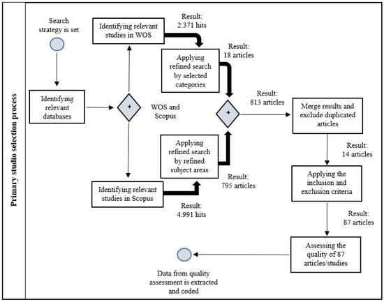 Through the first part of the search, WoS and Scopus were checked using keywords: “Data Envelopment Analysis” + “Supplier” + “Sustainable”. This approach resulted in 813 hits (795 in Scopus and 18 in WoS). The aforementioned keywords are searched in “Title, Abstract, and Keywords” of documents belonging to Scopus and WoS databases.