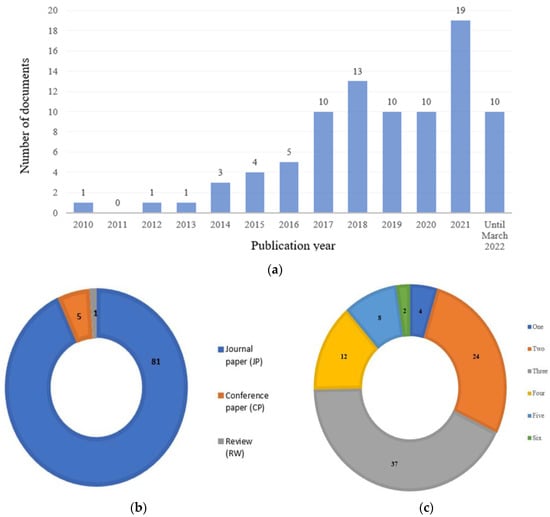 Basic bibliometric information of sustainable suppliers with DEA literature: (a) distribution of documents per year, (b) distribution of publication type, (c) distribution of the number of document authors. Source: Authors’ work, 2022.