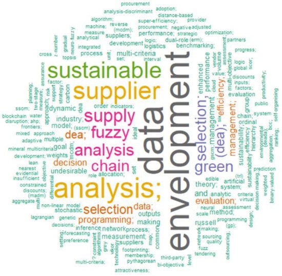 The word cloud of the DEA literature regarding the selection of sustainable suppliers using the DEA approach based on the most popular keywords in DEA is presented in Figure 3. A word cloud is “a visualization technique that provides the user with an overview of the content of a collection of texts”, where the word size in the word cloud represents the frequency with which the words appear in the text collection [45]. Moreover, a “word cloud is a visual representation of word frequency”, which means that the larger the words, the more frequently does the term appear within the text collection [46]. Word clouds have been widely used in bibliometric analysis as a guidance tool that helps identify the focus of the large set of published articles. The word cloud in this article was presented with the text mining technique and the word cloud option in R (Figure 3). This simple analysis and the tool we used prove that the search strategy of this article was chosen correctly, as the most popular keywords and key phrases which appear in the word cloud of the selection of sustainable suppliers with DEA also appear in the search keywords.
