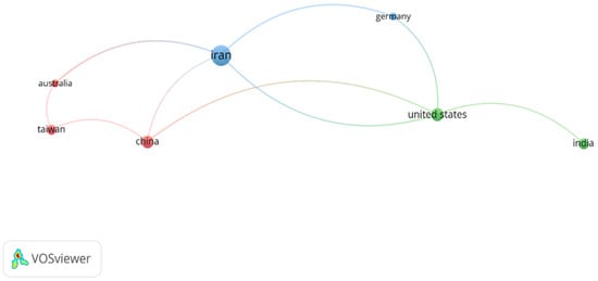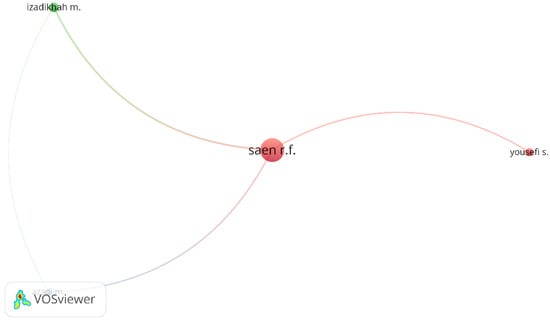 With the help of the VOSviewer software, the network visualization for country co-authorship was created (Figure 5), and the network visualization of the top authors’ density visualization is presented in Figure 6. A total of 32 countries were identified as contributing countries. However, only 7 of them are shown in Figure 5 since they are the most contributing countries in the area of sustainable supplier selection with DEA. Moreover, as shown in Figure 6, five authors appear in the density visualization due to their contribution to this field (these are Saen R.F., Izadikhah M., Yousefi S., and Azadi M.).