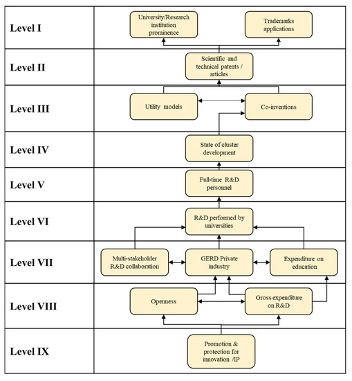 | D11 | State of cluster development | Alludes to the extent to which innovation clusters are widespread. It includes the degree of development and deep clusters (i.e., geographic concentration of producers of services and products, suppliers, firms, and institutions in a specialized field). Moreover, considers the relationship between government, industry, and universities to enhance innovation and creativity. | [17,21,22,31,32,38,39,41,58,64,65,71,72,78,88,89,90,91,95,104,105,106] |