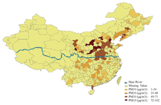 Figure 2 illustrates the graphical relationship between city location and air pollutant concentrations using ARCGIS 17.2 (where the darker the color, the more serious the air pollution). The blue line denotes the Huai River boundary, and each color block shows the location of the city and the concentration of air pollutants. Significant differences in air pollutant concentrations can be clearly identified between the cities on the north and south sides of the Huai River boundary. We detail in