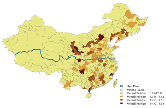 Figure 3, where the depth of the color indicates the severity of the resident’s mental problems. The Huai boundary results in a statistically significant decline in the mental health of the northern residents compared to that of their southern counterparts. Similarly, we systematically report North–South differences in mental problems in
