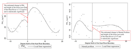 Table 5 shows a statistically significant difference in air quality and mental health between the southern and northern residents near the Huai boundary after adjusting for the covariates. The Huai River boundary resulted in a discontinuous increase in PM