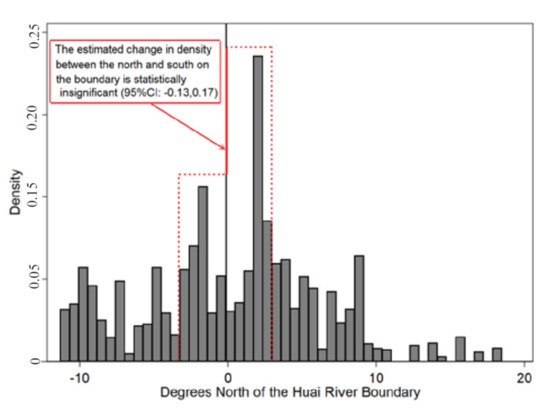 Figure 4) across locations within a standard bin from the boundary. The discontinuous change in air pollutant on the boundary of the Huai River indicates that the arbitrary heating policy has led to a 11.4-(μg/m
