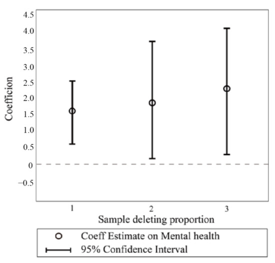 Figure 7 clearly reveals that the coefficients remain statistically significant after removing 1% (95% CI: 0.47, 2.21), 2% (95% CI: 0.16, 3.11), and 3% (95%CI: 0.14, 3.54) of the samples near the breakpoints, respectively, which indicates that our samples were not manipulated near the breakpoint.