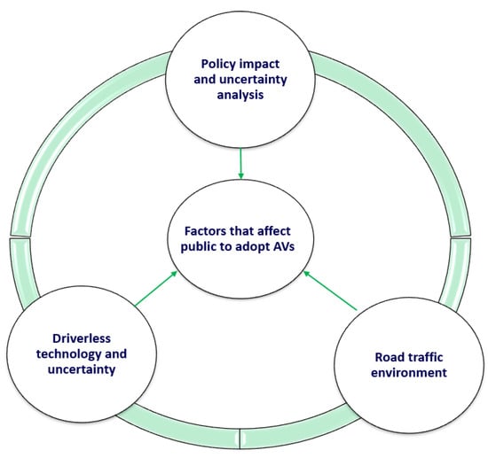 Even before the 21st century, researchers and industrial partners had undertaken substantial research to develop a highly autonomous vehicle that is reliable and can adapt to different road conditions. Ref. [10] summarises 19 peer-reviewed articles about the roles of users in shared, automated, and electric mobility, including drivers, passengers, owners, pedestrians, planners, and policymakers. They cover individual functional perceptions (save money, convenience, etc.), practical societal perceptions (GHG emissions, traffic congestion, and safety), and societal–symbolic perceptions. The article briefs the benefits and problems that the emergence of AVs can bring; for example, the car share program can increase car accessibility, and adding automation for plug-in electric vehicles (PEV) can remove the customers’ concerns regarding charging inconvenience. However, the likelihood of widespread uptake and the direction of societal impact remains uncertain. In the present study, we examine the factors or uncertainties that can affect the public adoption of AVs. First, in Section 3.1, “Synthesis of factors affecting AVs adoption”, we present the synthesis of three major themes or factors (driverless technology and uncertainty, road traffic environment, and policy impact) that can affect the public adoption of AVs, as shown in Figure 1. This section is followed by Section 3.2, “Modeling approach”, which presents an analysis of modelling approaches where these factors have been explored along with the key findings. Finally, insights gleaned from the factors and the outcomes of the modelling approaches are discussed in detail under Section 3.3, “Factors that affect the public to adopt AVs”.