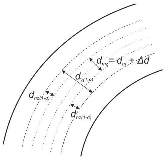 where dz(1−α) is the safe width of the maneuvering area for the bend at the confidence level (1 − α), dmz is the maneuvering component of the width of the safe maneuvering area at the bend, dnz(1−α) is the navigational component of the width of the safe maneuvering area at the bend determined at the confidence level (1 − α), dm is the maneuvering component of the width of the safe maneuvering area on a straight section and ∆d is the widening of the ship’s lane at the bend.